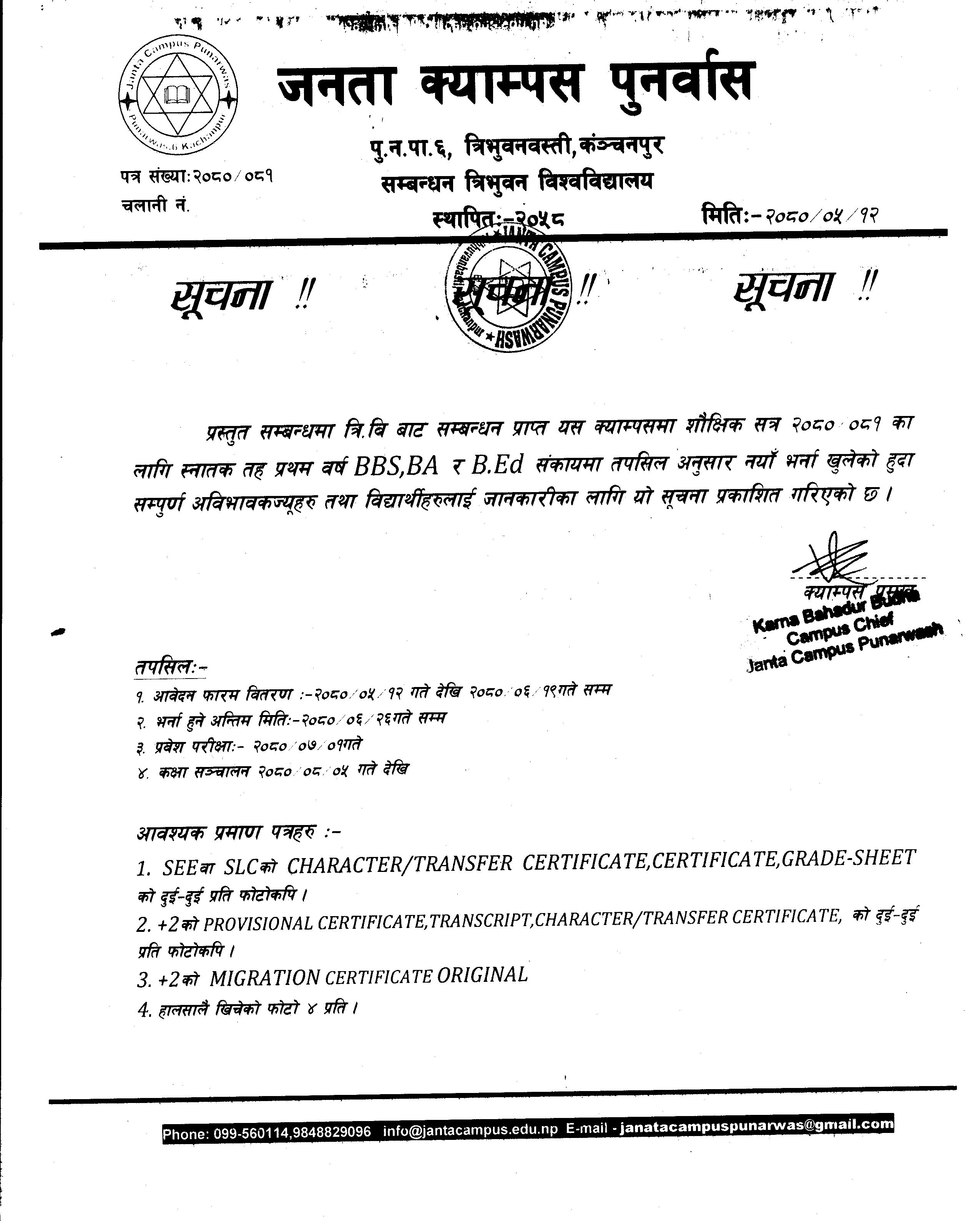 शैक्षिक सत्र २०८०/०८१ का लागि भर्ना सम्बधि सूचना