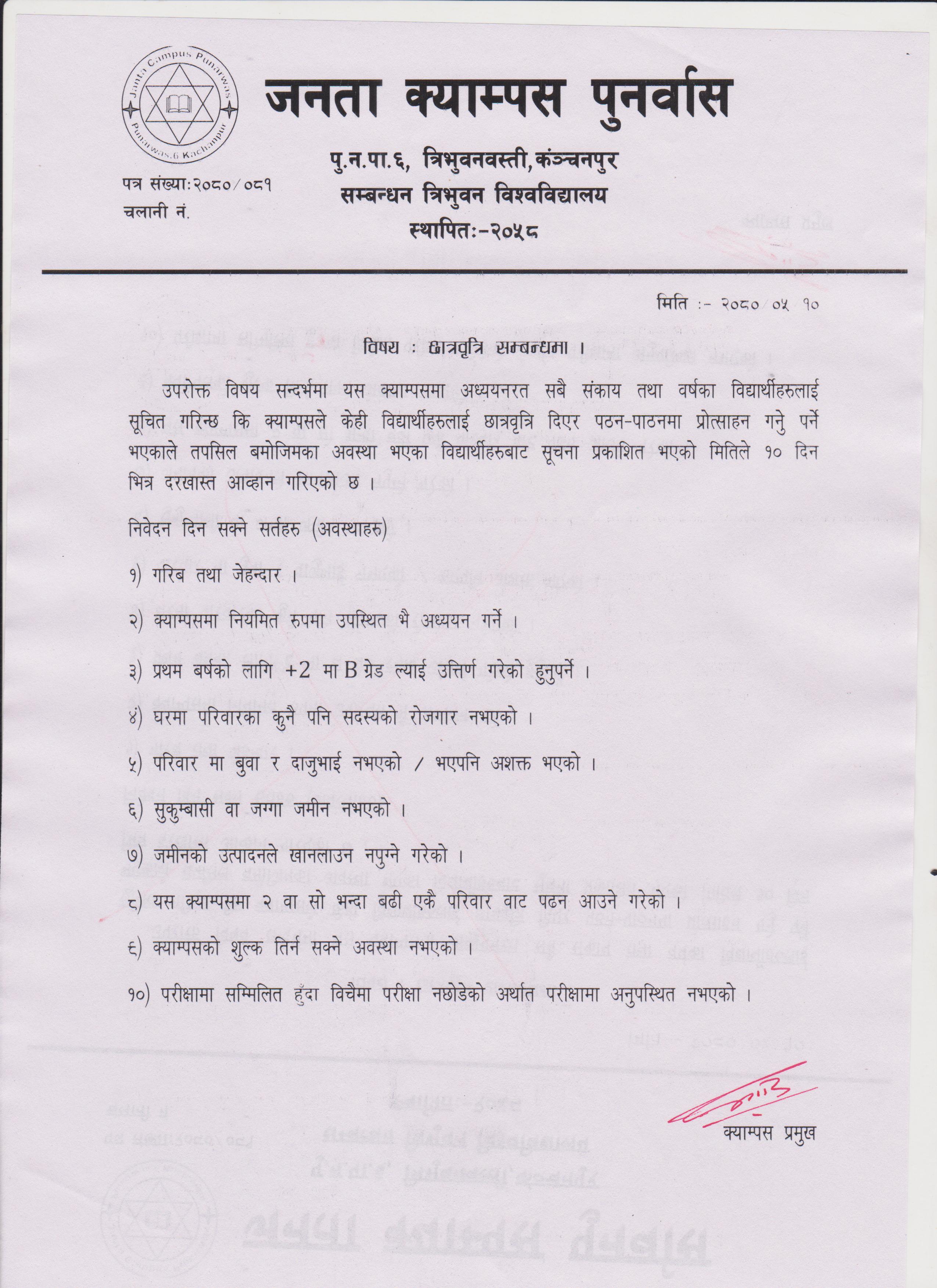 छात्रवृत्ति सम्बधि सूचना (निवेदन दिन सकिने सर्तहरु सहित)